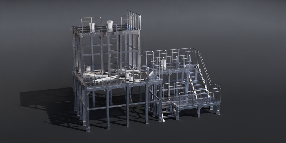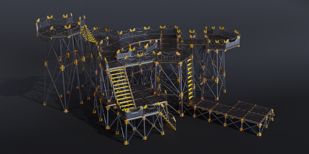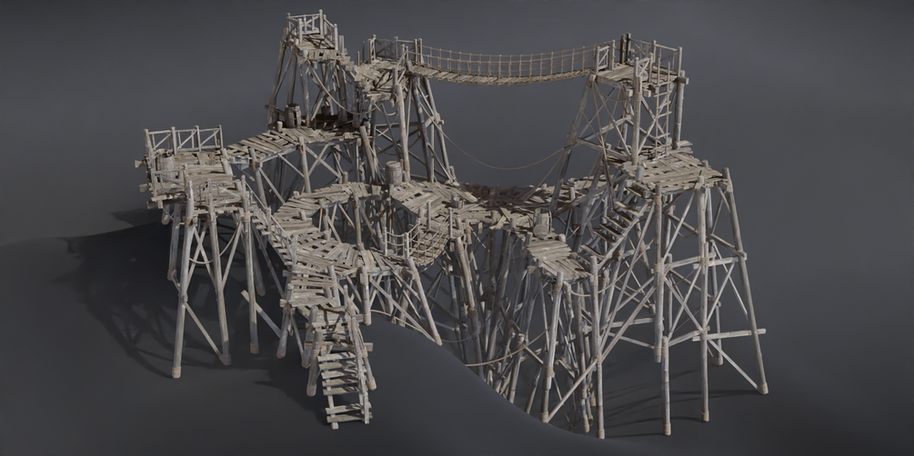 The core functioning of the node is that at each vertex it will spawn a pillar, at each edge a support beam and on each plane it will instance planks following the general direction of the face.A lot more customizable details will be generated as well. There are a lot of ways to customize the placement and scale of each piece and choose a different style for your platform with ways to scatter objects on it and control the scatter areas via vertex groups.